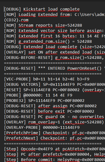 I now have a clean commit with HelpyProg! Each instruction updates only HelpyProg, and the PC commits at the end of the cycle. A single update point, no double primes. All prefetches and extension reads go through with no side effects. I added lines for LEA/BRA/BSR/PEA/MOVE(d16, PC), so the emulator catches regressions early. And finally, a stable boot trace! Kickstart runs continuously inside the ROM with proper opcodes (7401, 7A00, DA98) and no garbage! The project is developing incredibly fast, and best of all, two excellent devs have offered to help me! More in the coming days.